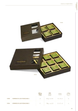BOXES & COLLECTIONS conFeZioni BoXeS & collectionS 14148 14134 14148 VIENNESI DE LUXE PISTACCHIO 4 4 80 g - oz 2,82 15 x 15 x 4 8 14134 VIENNESI DE LUXE PISTACCHIO 9 9 180g - oz 6,35 21 x 21 x 4 6 23