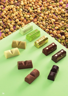 EN White chocolate with crunchy Piedmont Hazelnut grain, with crunchy whole pistachios